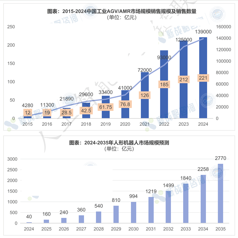 根據新戰略移動機器人產業研究所統計, 2024年ZG工業應用移動機器人銷售規模為221億, 同比增長4.25%; 銷售數量為139000臺, 同比增長1 1.2% ZG市場人形機器人出貨量超2800臺, 市場規模超20億; 清潔及環衛機器人累計出貨超12900臺 (不含小型家用墻面清潔泳池清潔機器人) , 市場銷售規模約 27.6億元。 2024年, ZG智能移動機器人整體市場已突破300億元。