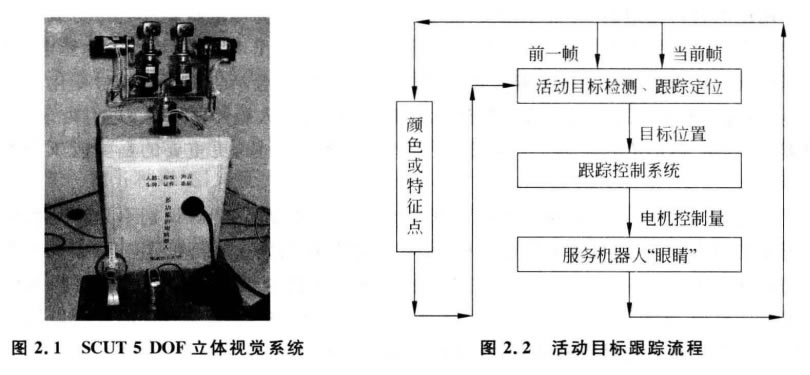 圖2.1所示的服務(wù)機(jī)器人“眼睛”是一個(gè)5 DOF 立體視覺(jué)系統(tǒng),它能夠跟蹤和識(shí)別活 動(dòng)的目標(biāo)。它是由 SCUT “智能計(jì)算機(jī)”科研團(tuán)隊(duì)研制成功的。該“眼睛”包括兩個(gè)彩色 攝像機(jī)、圖像處理板、個(gè)人電腦、數(shù)據(jù)采集卡、5個(gè)直流電機(jī)、直流電機(jī)驅(qū)動(dòng)器。考慮到主 動(dòng)跟蹤和目標(biāo)特征與速度和魯棒性等要求,該“眼睛”以基于顏色的跟蹤算法為基礎(chǔ),結(jié) 合目標(biāo)特征跟蹤及目標(biāo)運(yùn)動(dòng)預(yù)測(cè)等就可以對(duì)活動(dòng)目標(biāo)進(jìn)行跟蹤和識(shí)別。