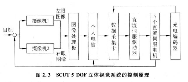 SCUT 5 DOF 立體視覺(jué)系統(tǒng)的控制原理如圖2.3所示,兩個(gè)彩色攝像機(jī)拍攝待識(shí)別 目標(biāo)圖像,經(jīng)過(guò)圖像處理板后送入個(gè)人電腦進(jìn)行分析,經(jīng)過(guò)顏色或特征跟蹤算法處理后, 形成5個(gè)直流電機(jī)的轉(zhuǎn)角控制指令,并經(jīng)由數(shù)據(jù)采集卡和直流電機(jī)驅(qū)動(dòng)器放大后驅(qū)動(dòng)5個(gè)直流電機(jī)轉(zhuǎn)動(dòng),從而帶動(dòng)兩個(gè)攝像機(jī)分別或共同作上、下、左、右、旋轉(zhuǎn)運(yùn)動(dòng),跟蹤待識(shí) 別目標(biāo)。無(wú)論待識(shí)別的目標(biāo)怎樣活動(dòng),只要不離開(kāi)兩個(gè)攝像機(jī)的視覺(jué)范圍,這個(gè)跟蹤和 識(shí)別過(guò)程就一直持續(xù)地進(jìn)行下去。由圖2 .3可以看到,5個(gè)直流電機(jī)的輸出(它們的轉(zhuǎn) 動(dòng),即兩個(gè)攝像機(jī)的運(yùn)動(dòng))是直接連接到或者說(shuō)跟蹤目標(biāo)的。