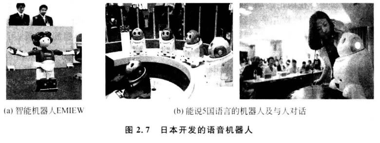 日本日立公司也研制了一臺智能機器人EMIEW, 它的個頭和小孩一樣,依靠輪子移 動,如圖2.7(a)所示。由于身上裝有數碼相機和雷達探測器,它可以自動地躲避障礙物。 同時它的詞匯儲備量達到100多個,能夠對一些簡單的聲音指令做出反應,并且還能夠 和人進行簡單的對話交流,甚至播報天氣預報等。第二代 EMIEW2 機器人可以通過無 線電裝置接收指令,然后毫不費力地在辦公室之間來回奔波,為辦公室人員跑腿。它站 立時身高大約為31.5英寸,體重為29磅。它能夠對障礙物應付自如,對人的語音做出 回應,并且一次充電后即可工作1小時。此外,能說5國語言的機器人及與人對話的機 器人也已經誕生了,如圖2.7(b) 所示。在我國舉辦的日語演講大賽現場上,參加比賽的 選手以及日語院校的學生不但與該機器人進行了交流互動,而且該機器人還獻上了許多 精彩舞蹈和歌曲。