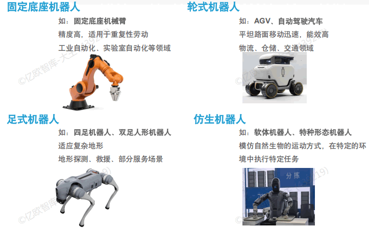 具身智能的物理載體形態豐富多樣,可以將其劃分為幾大類別:固定底座機器人、