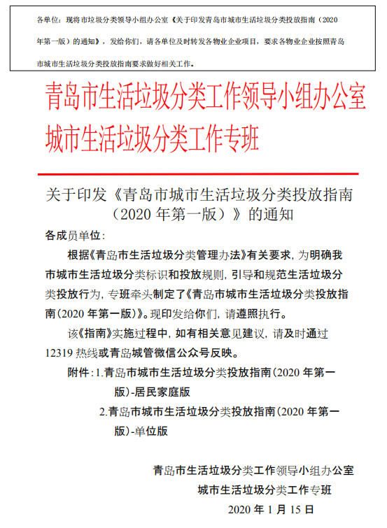 根據(jù)《青島市生活垃圾分類管理辦法》有關(guān)要求,為明確我市城市生活垃圾分類標(biāo)識和投放規(guī)則,引導(dǎo)和規(guī)范生活垃圾分類投放行為,專班牽頭制定了《青島市城市生活垃圾分類投放指南(2020 年D一版)》。現(xiàn)印發(fā)給你們,請遵照執(zhí)行。
